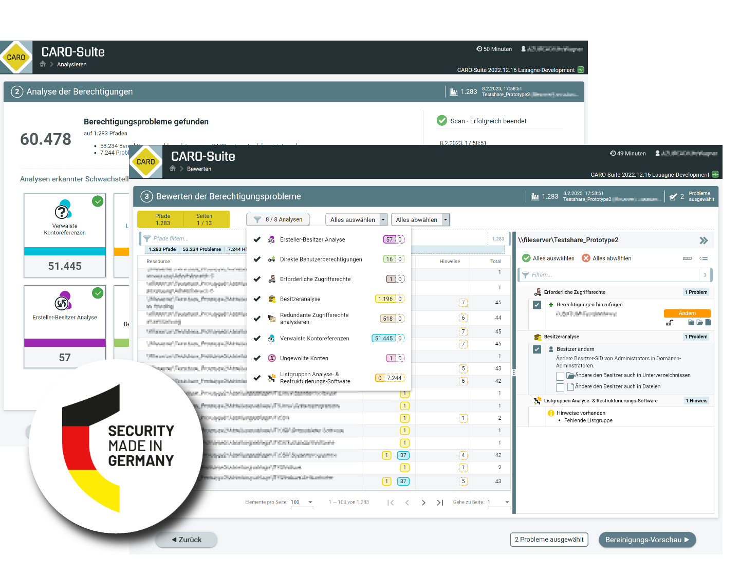 - Für Ihren Aufräumprozess assistiert Ihnen CARO mit konkreten Handlungsempfehlungen und einer Begründung zur Minimierung Ihrer gefundenen Risiken.