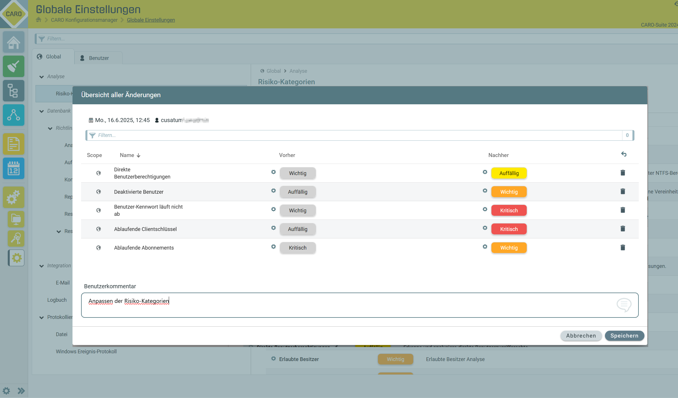 Alle geplanten Änderungen sind hier in einer kompakter Liste zusammengefasst, damit Sie abschließend Ihre Bereinigungen einfach und schnell verifizieren können. Nach Eingabe Ihres Änderungskommentars wird CARO alle Probleme in einem Schritt bereinigen.